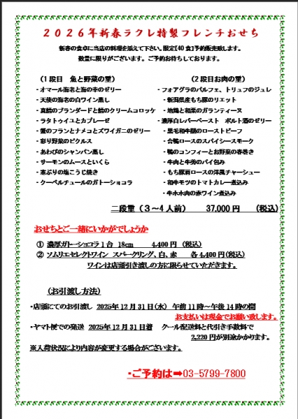 2026年新春ラクレ特選おせちの販売 2025-10-01 12:05:27 今年で14回目になります、ラクレ特選おせちの販売をさせて頂きます。数量限定での販売の為ご購入をお考えのお客様お早めのご検討お願い致します。ご予約、お問い合わせは、お電話でお願い致します。2段重(8寸)22品37.000円税込お支払いは、現金もしくは、世田ペイでお願い致します